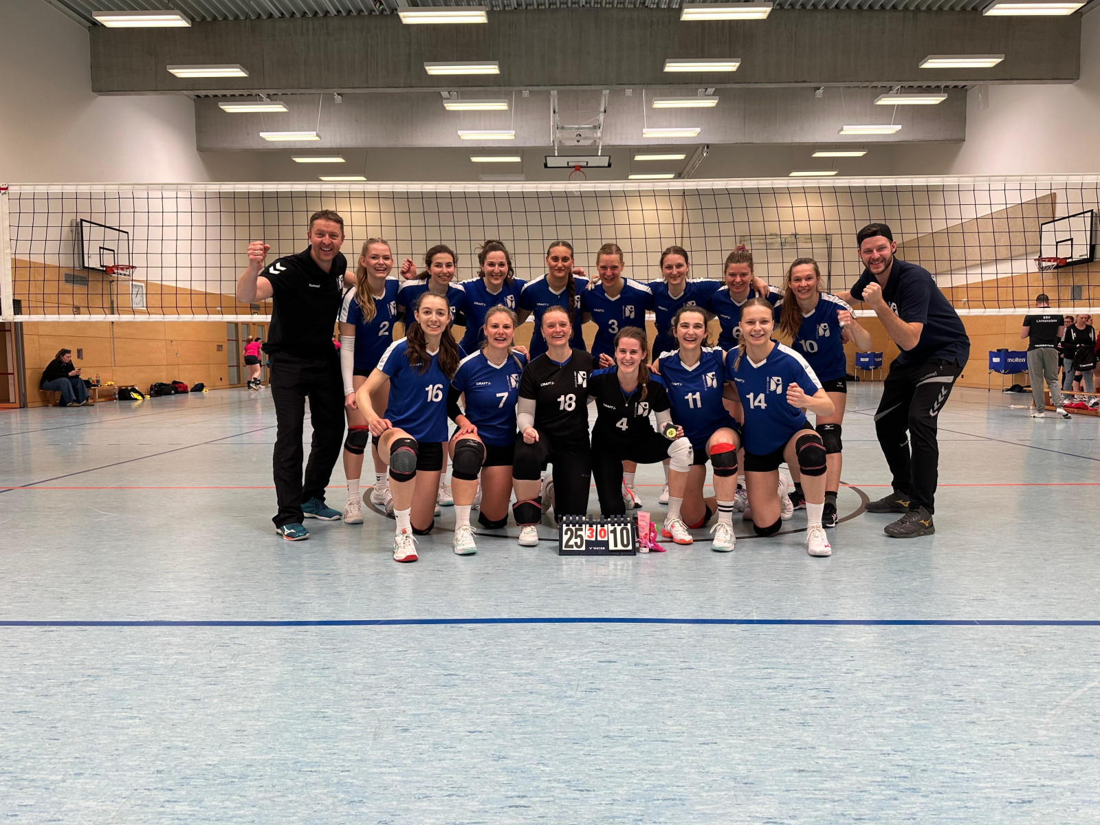 Zunächst schlagen wir mit guter Stimmung gegen das Team aus Lichtenstein auf. Mit schönen Angriffen, Angriffslösungen sowie starken Aufschlägen zeigen wir zahlreiche Highlights. Zwar schleichen sich ab und an kleine Wackler ein, doch können wir insgesamt unsere Stärken gut ausspielen. Zu 16, 16, 10 siegen wir sogar recht deutlich. Vor allem eine überragende Abwehrleistung, durch Annahmechefin Alice, bleibt im Gedächtnis. Sie sichert sich damit die MVP Auszeichnung.