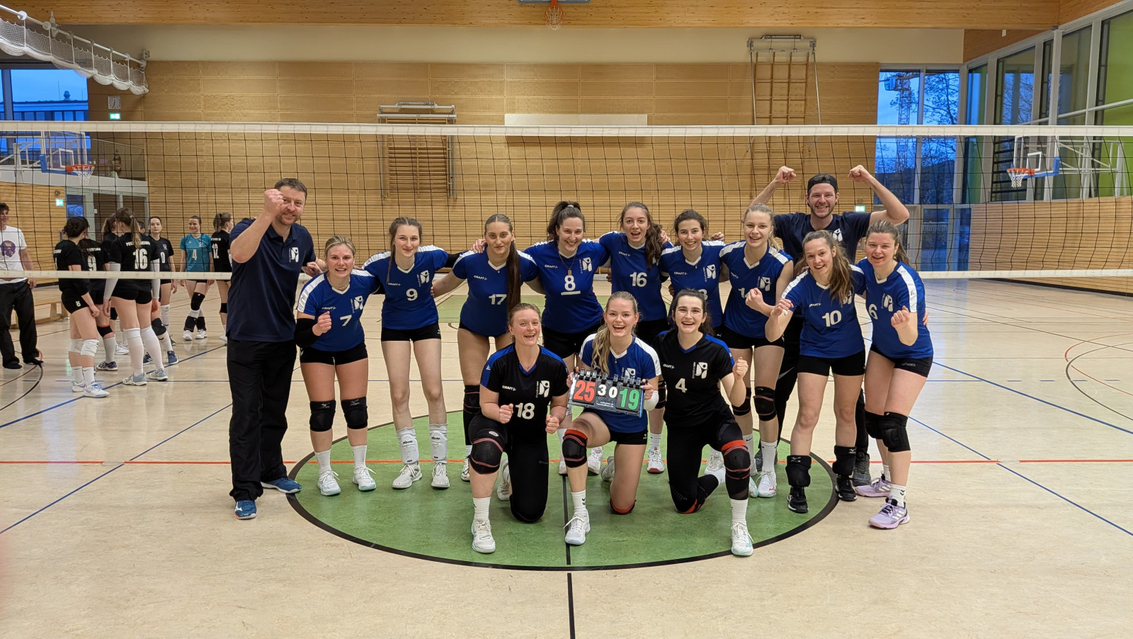 Durch eine konstant starke Leistung im Aufschlag fällt es unseren Gastgeberinnen schwer ins Spiel zu finden. Wir gewinnen den ersten Satz  25:14. Ab und zu schleichen sich  auch bei uns kleine Abstimmungsfehler ein. Doch die guten Aufschläge und clevere Lösungen sorgen dafür, dass wir den Sieg mit 25:20 und 25:19 holen.